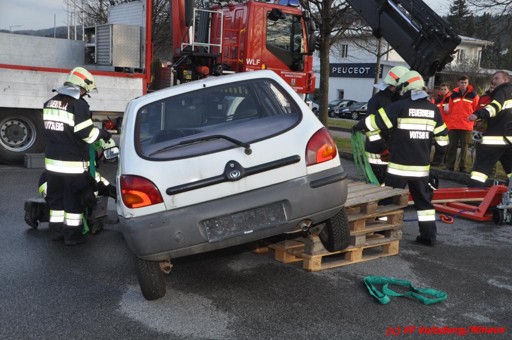 VOITSBERG, am 29.03.2016 Im ersten Teil der Übung zeigte OBI Michael Münzer unter Verwendung des WLF-Kran die Handhabung der neu angeschafften Spreiztraversen bei der Bergung eines PKW. Hier geht es in erster Linie darum, die KameradInnen während der Bergungsarbeiten von Unfällen zu schützen und als zweites die zu bergenden Fahrzeuge ohne weitere Schäden von der Unfallstelle zu entfernen.