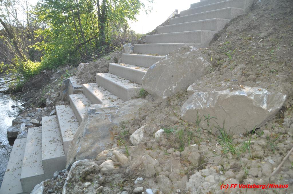 VOITSBERG, am 09.05.2016 Die Bevölkerung wird sich fragen, warum entlang der Kainach im Gemeindegebiet von Voitsberg insgesamt 11 Stiegen angebracht wurden. Die Erklärung besteht darin, dass diese im Zuge des Ausbaues des Hochwasserschutzes zum Verlegen der Saugschläuche von den Tragkraftspritzen bei Feuerwehreinsätzen angelegt wurden, um Wasser zur Brandbekämpfung aus der Kainach zu pumpen. Erstmals wurde eine Übung bei solch einer Saugstelle unter dem Schloss Greißenegg mit der Annahme eines Brandes beim alten Bauhof in der Rottenbachergasse. Das Aggregat wurde an oberster Stelle der Stiege abgestellt und insgesamt 6 Saugschläuche angelegt. Es wurde sodann eine 300 Meter lange Zubringleitung zum vermeintlichen Brandobjekt gelegt und mit dem aus der Kainach gepumpten Wasser das neue HLF 3 - Tunnel mit Wasser versorgt. Es wurde seitens des HBI Ing. Klaus Gehr und OBI Michael Münzer feuerwehrtaktisch der Brandangriff erläutert. Diese Saugstelle hat sich bestens bewährt. Nach der Nachbesprechung wurde vom Übungsleiter OLM d. F. Alexander Wallner, welchem zur erfolgreichen Absolvierung des Einsatzleiterlehrganges gratuliert wurde, das Übungsende befohlen.