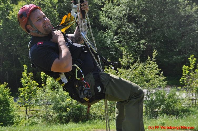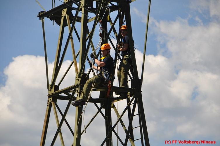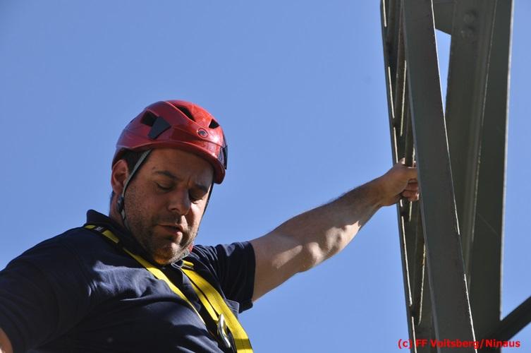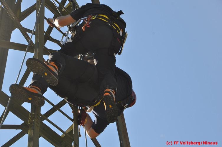 Erste Übungsannahme war die Rettung einer verletzten Person aus misslicher Lage vom einem 17m hohen Gittermasten, wobei der Retter mit Selbstsicherung sich zum Verletzten hocharbeitete. Um die Person retten zu können, mussten zwei Seile ca. 2 m über den Verunfallten angebracht werden, damit eine rasche und vor allem sichere Rettung gewährleistet war.