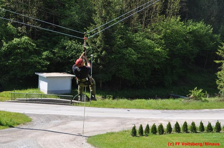Das zweite Szenario war die Errichtung einer Seilbahn zum Überbrücken einer Schlucht, um Material und Mannschaft vom Ausgangspunkt zum Einsatzort zu bringen. Die Übung verlief ohne Zwischenfälle und diente der guten Zusammenarbeit zwischen den Feuerwehren Bärnbach und Voitsberg und der Festigung der MRAS-Einheit Nord.