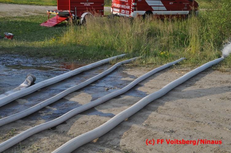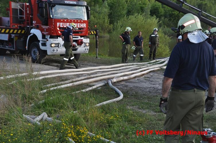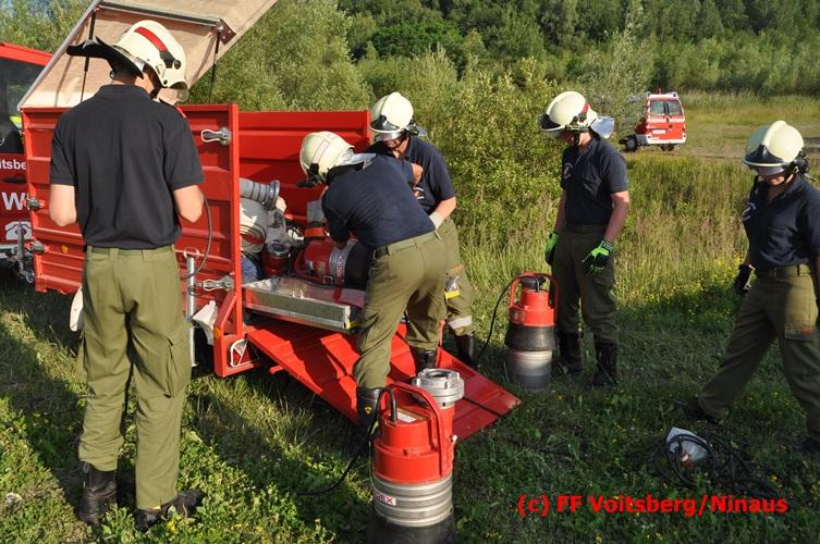 VOITSBERG, am 04.07.2016 Im ehemaligen Tagbaugelände Zangtal fand eine Übung mit dem Stromgenerator und Hochleistungs-Tauchpumpen statt. Als Auffrischung bereiteten HBI Ing. Klaus Gehr und LM d. F. Harald Kremaucz diese Übung vor, um in der bevorstehenden Gewitterzeit gerüstet zu sein. Mit den 5 Hochleistungspumpen wurden in 10 min ca. 100.000 Liter Wasser mit einer Energieleistung von 43 KV umgepumpt. Diese Pumpen haben bereits u.a. bei größeren Einsätzen (Oberndorf/Salzburg, Bahnhof Voitsberg) ihre Leistung bewiesen.