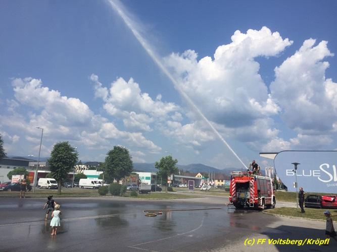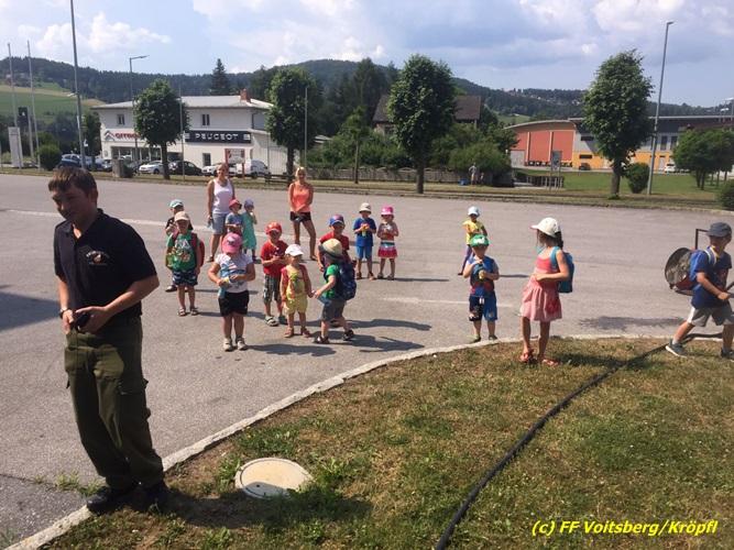 VOITSBERG, am 21.06.2017 Zahlreiche Kindergartenkinder mit ihren Begleitpersonen fanden sich am 21. Juni 2017 bei prachtvollem Sommerwetter im Rüsthaus der Stadtfeuerwehr Voitsberg ein, um ein wenig die Feuerwehr zu beschnuppern. Nach der Begrüßung durch den Zugskommandanten Alexander Kröpfl in der Bereichsfunkzentrale „Florian Voitsberg“ wurde diese den Interessierten vorgestellt. Dann ging es, nach einer flüssigen Stärkung mit einem Kracherl weiter, um die Fahrzeuge kennenzulernen, einmal in einem solchen Platz zu nehmen und das Folgetonhorn von innen zu hören. Vorführungen mit dem Strahlrohr, wobei die Kinder dieses bedienen durften, der nasse „Einsatz“ mit dem Wasservorhang und einige andere Vorstellungen von Einsatzgeräten machte den Kindern viel Spaß und werden ihnen in Erinnerung bleiben. Ein abschließendes Gruppenfoto auf der Ladefläche des WLF rundete diesen für die Kinder sicherlich unvergesslichen Tag ab.