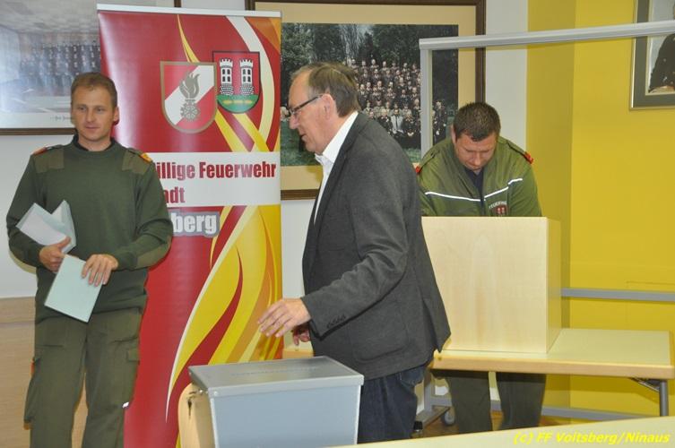 VOITSBERG, am 30.10.2017 Da der bisherige stellvertretende Feuerwehrkommandant der FF Voitsberg OBI Michael Münzer aus gesundheitlichen Gründen seine Funktion zurücklegte, musste laut Statuten des Landesfeuerwehrgesetzes eine Neuwahl zeitgerecht abgehalten werden. Diese fand unter Vorsitz des Bereichsfeuerwehrkommandanten LFR Engelbert Huber im Sitzungssaal der Stadtfeuerwehr Voitsberg statt. Er konnte als Ehrengäste Bürgermeister Ernst Meixner, Finanzstadtrat Franz Sachernegg und Brandrat Christian Leitgeb begrüßen. Beim BerFwKdo sind fristgerecht zwei Wahlvorschläge, beide lautend auf Bernd Unger, eingelangt. Nach geheimer Wahl wurde BidF Ing. Bernd Unger fast einstimmig zum neuen Feuerwehrkommandant - Stellvertreter der FF Voitsberg gewählt. Gratulationen kamen in Kurzansprachen der Ehrengäste und des Wehrkommandanten ABI Ing. Klaus Gehr, sowie viel Applaus aus den Reihen der KameradInnen und dem Versprechen des Neugewählten, die Zusammenarbeit mit den Führungskräften und der Mannschaft zur vollsten Zufriedenheit zum Wohle der FF Voitsberg erfüllen zu wollen.