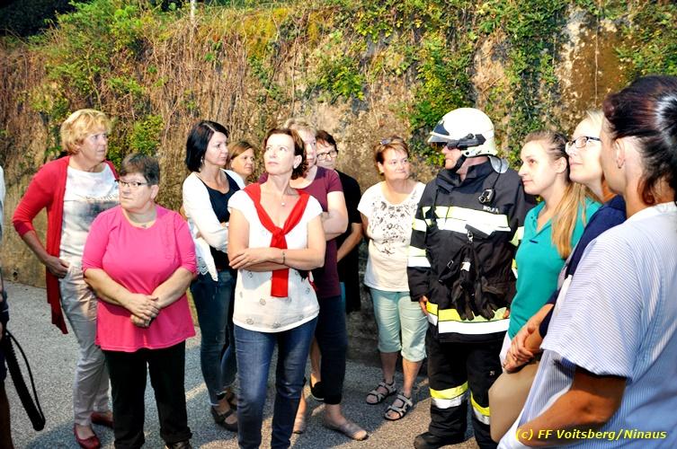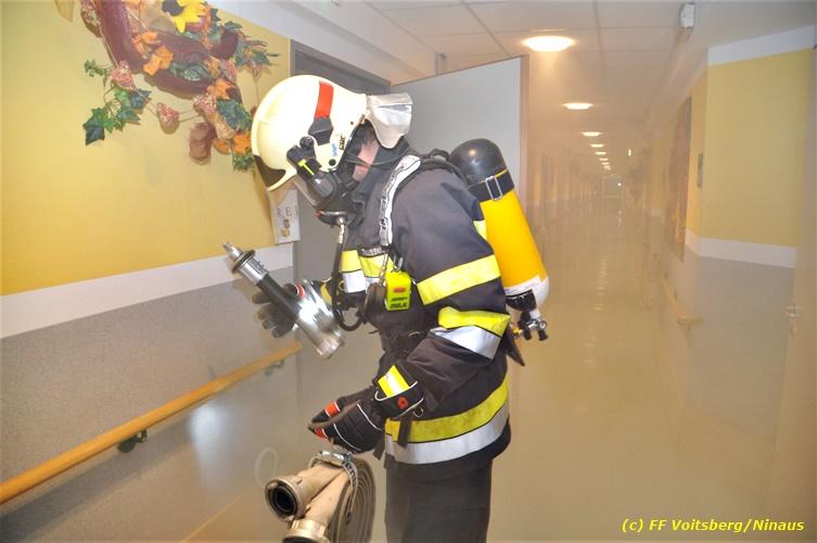 VOITSBERG, am 17.09.2018 Im Rahmen der regelmäßigen Übungen hielt die FF Voitsberg am Montag, 17. September 2018 eine Einsatzübung im Bezirksaltenheim am Voitsberger Schlossberg ab. Übungsannahme war ein Brand in einem Zimmer im zweiten Obergeschoß, in welchem eine betagte Person vermisst wurde. Nach Eintreffen am Übungsort wurde Einsatzleiter BM Rene Sorger von einem Bediensteten empfangen und über die Einsatzlage informiert. Die bereits bei der Anfahrt mit schwerem Atemschutz ausgerüstete Mannschaft des HLF 3 führte mit einem Atemschutztrupp einen Innenangriff durch und konnte aus dem stark verrauchten Raum eine Person retten und zur ärztlichen Versorgung ins Freie bringen. Die Mannschaft des HLF 4 versorgte die Steigleitung mit Löschwasser und stellte einen Atemschutz-Reservetrupp. Nach der erfolgreich abgeschlossenen Übung fand am Vorplatz eine Übungsnachbesprechung statt. Daran nahm fast das gesamte Personal der Pflegeanstalt teil und wurde von BI Karlheinz Buchegger und Übungsleiter OLMdF Christian Buchegger über die Chronologie nach der Alarmierung durch die Brandmeldeanlage und der Ausrüstung der Feuerwehrmannschaft informiert. Abschließend wurden die Einsatzkräfte der FF Voitsberg zu Speis und Trank in den Speisesaal eingeladen. Text und Fotos: Walter Ninaus/FF Voitsberg