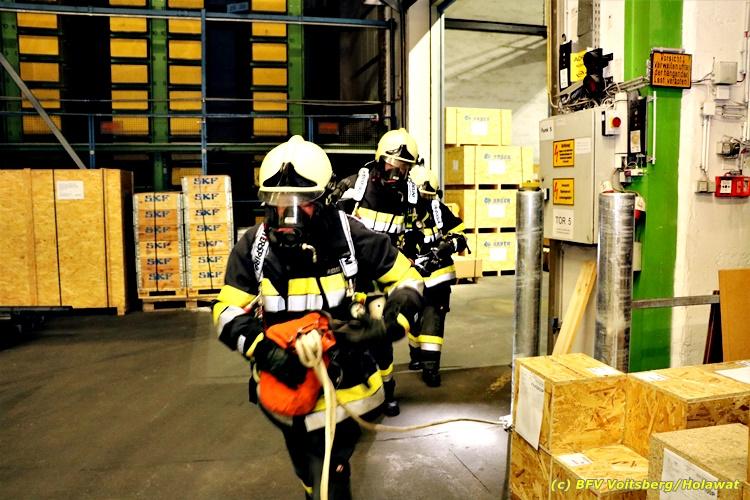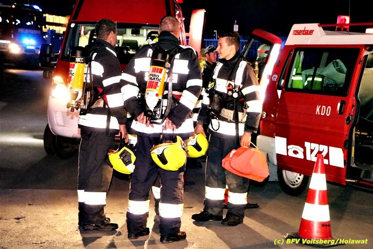 Der Feuerwehrabschnitt 2 des BFV Voitsberg veranstaltete am Montag, 15. Oktober 2018 bei der Firma Bauer in Voitsberg eine Abschnittsübung. Der Wehrkommandant der durchführenden Feuerwehr Voitsberg, BR Ing. Klaus Gehr konnte vor der Übung zahlreiche Übungsbeobachter bei der Übungserklärung begrüßen: Bürgermeister Ernst Meixner, Vizebürgermeister Walter Gaich, Stadtrat Franz Sachernegg, GR Werner Blumauer, GR Horst Kovacic, GR Johann Rauchegger, vom Roten Kreuz Voitsberg-Köflach BezirksrettungskdtStv. Florian Angerer und Elisabeth Jauk, das Team von Kanal3 und im speziellen die Vertreter der Firma Bauer mit ihrem Chef Otto Roiss. Gegen 18.30 Uhr wurde die Freiwillige Feuerwehr der Stadt Voitsberg über einen Brand bei der Firma Pumpen Bauer alarmiert, dass ein Teil einer Halle bereits in Vollbrand stehe und 5 Personen in den Hallen noch eingeschlossen seien bzw. die Halle nicht mehr verlassen konnten. Einsatzleiter OBI DI (FH) Bernd Unger alarmierte über Florian Voitsberg sofort die Feuerwehren des Abschnittes 2 sowie die Drehleiter der FF Köflach. Die Feuerwehr Voitsberg hat nach Eintreffen am Einsatzort sofort mit 2 Tanklöschfahrzeugen und HD-Rohr eine Erstbrandbekämpfung begonnen und ein Atemschutztrupp hat die Suche und das Retten von den vermissten Personen begonnen. Eine weitere Mannschaft hat eine Zubringleitung für den Wasserbezog vom zwei Kilometer entfernten Grafenteich zu errichten begonnen. Zwei Tragkraftspritzen haben die Wasserförderung über zwei B-Leitungen übernommen. Die nach der Reihe eintreffenden Wehren wurden vom Einsatzleiter Unger Bernd über das derzeitige Ausmaß informiert und sie erhielten jeweils ihre Einsatzbefehle. Vordergründig war natürlich die Suche und Rettung der weiteren vermissten Personen. Die Drehleiter Köflach mit dem Wasserwerfer hat den Brandherd aus 30 Meter Höhe bekämpft. Weiters wurden weitere 3 Wasserwerfer zur Brandbekämpfung eingesetzt. Die Wehren des Abschnittes 2 (Krems, Bärnbach, Afling Geistthal, Kainach, Stallhofen und Södingberg) wurden für weitere Löschangriffe der Halle wie auch zum Schützen der angebauten und angrenzenden Hallen beauftragt. Bei der Schlusskundgebung und nach der Meldung an Abschnittskommandanten ABI Alfred Jauk teilte BR Gehr, Kommandant der FF Voitsberg (durchführende Wehr der Abschnittsübung) mit, dass die Maxime der Übung die Bekämpfung eines Industriebrandes sowie die Wasserförderung in großen Mengen gewesen sei. Unter den Ehrengästen konnte ABI Alfred Jauk den Betriebsleiter der Firma Bauer Herrn Otto Roiss, Bereichskommandantstellvertreter BR Ing. Klaus Gehr, für alle Mitglieder des Bereichsfeuerwehrausschusses ABI d.V. Günter Höller, EBR Robert Klampfl, EABI Rudolf Gargitter, das Rote Kreuz unter Bezirksrettungskommandantstellvertreter Florian Angerer und den Brandschutzbeauftragten HBM Herbert Gratzer begrüßen. Zugleich wurde mitgeteilt, dass 147 Mann, 4 Wasserwerfer, die Drehleiter Köflach sowie 3 Atemschutztrupps und alle weiteren zur Verfügung stehenden Einsatzfahrzeuge des Abschnittes 2 eingesetzt waren. Nach dem Antreten wurde mit den zuständigen Gruppenkommandanten eine Nachbesprechung der Übung abgehalten, um etwaige Fehler oder Verbesserungen aufzeigen zu können. Anschließend wurde alle Übungsteilnehmer seitens der Firma Pumpen Bauer zur Verpflegung ins Rüsthaus Voitsberg eingeladen. Text: Artur Holawat, BFV Voitsberg Fotos: Artur Holawat/BFV Voitsberg, Walter Ninaus/FF Voitsberg, Franz Patz/FF Voitsberg