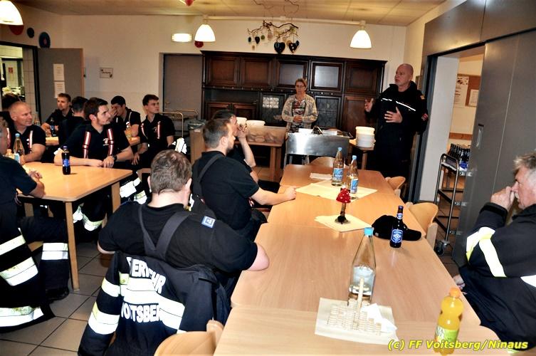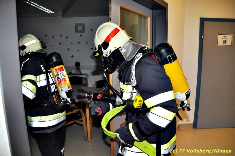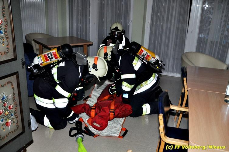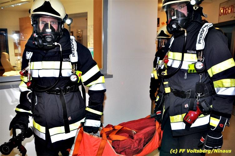 VOITSBERG, am 12.11.2018 Die FF Voitsberg führte am Montag, 12. November 2018 im Margarethenhof in Voitsberg eine Einsatzübung durch. Übungsannahme war ein Zimmerbrand im 1. OG, wobei sich eine Person im verqualmten Raum befand. Nach der Einweisung des Brandschutzwartes an die Einsatzkräfte und der Erkundung durch den Einsatzleiter BI d. F. Harald Kremaucz begab sich ein Trupp mit schwerem Atemschutz und einem C-Rohr über das Stiegenhaus in das betroffene Zimmer. In Kürze konnte der Brand gelöscht, die vermisste Person gefunden und aus dem Gefahrenbereich gebracht werden. Ein zweiter Angriff erfolgte über die dreiteilige Schiebeleiter über den Balkon. Nach abgeschlossener Übung meldete der Übungsleiter OLM Christian Buchegger an den Wehrkommandanten BR Ing. Klaus Gehr das Ende. BR Gehr bedankte sich bei beim Pflegepersonal für die Bereitschaft der Teilnahme an dieser Übung, um im Ernstfall helfend eingreifen zu können. Des Weiteren gilt der Dank an OLM Christian Buchegger für die Vorbereitung und den Verantwortlichen des Margarethenhofes für die Einladung zu Speis und Trank. Text und Fotos: Walter Ninaus, FF Voitsberg